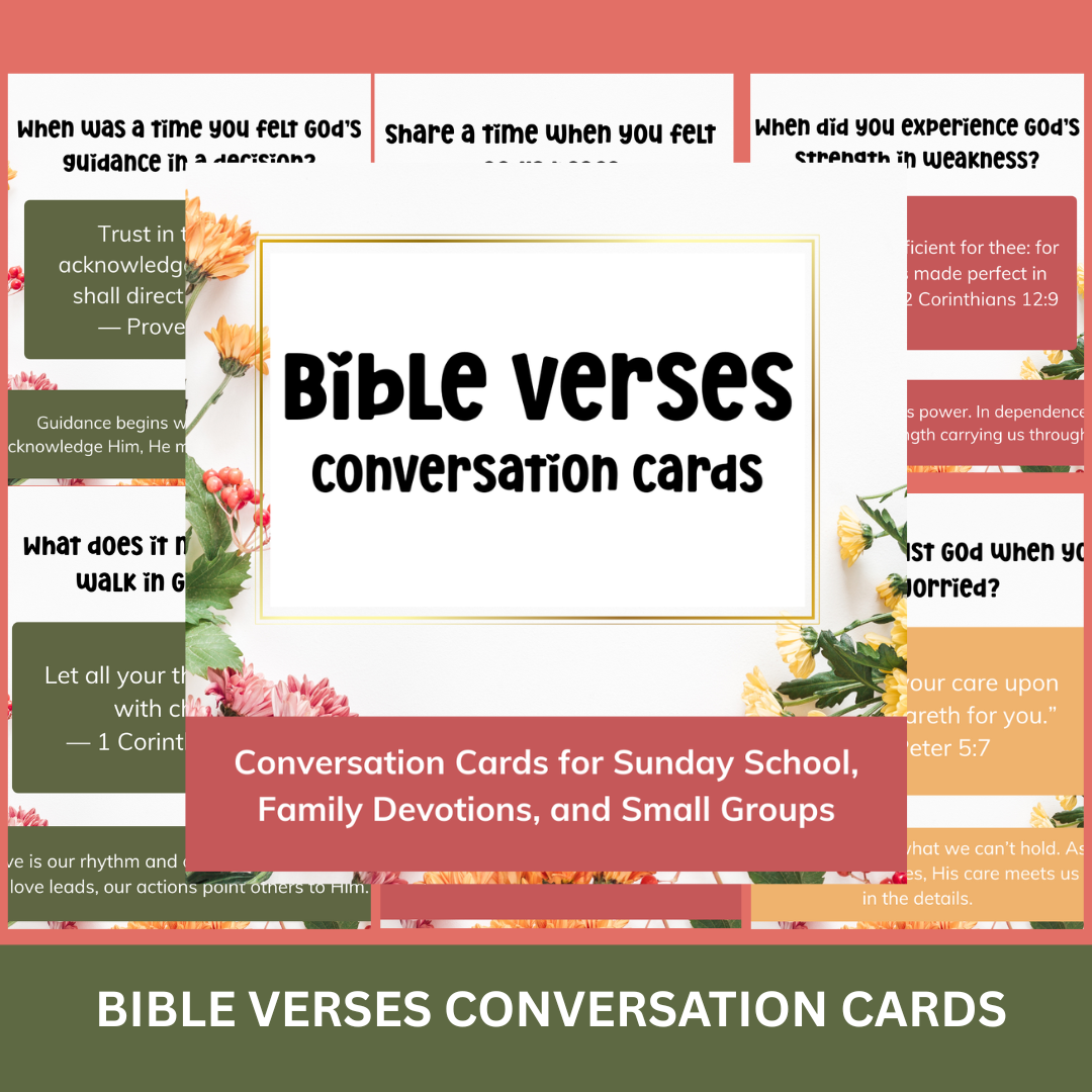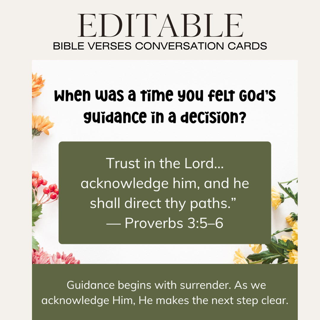Spark meaningful faith-based conversations anywhere with these editable Canva card templates. Each card includes a thoughtful prompt, a KJV Bible verse, and a short reflection, making them perfect for Sunday School, Bible studies, family devotions, or personal journaling.