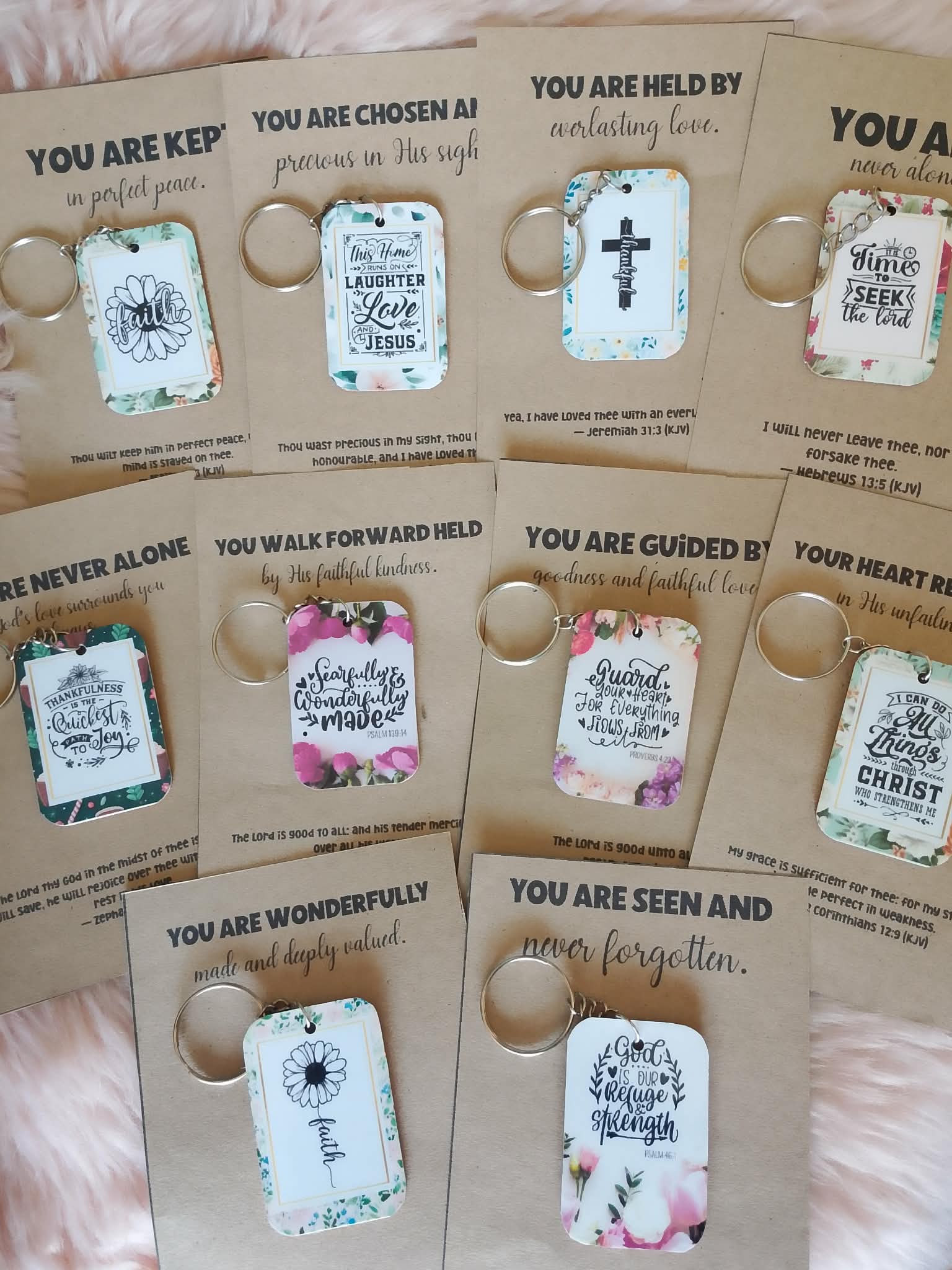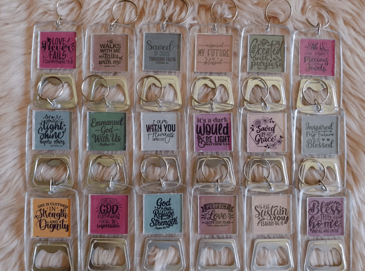 An acrylic bottle opener keychain designed with inspiring Bible verses to encourage your faith daily. Made from clear, durable acrylic with a smooth finish, it’s lightweight, easy to carry, and built for everyday use. Ideal for personal use or as a meaningful Christian gift. Perfect for church events, fellowships, ministry giveaways, party favors, and small business reselling. A simple everyday item with a powerful message of hope and faith.