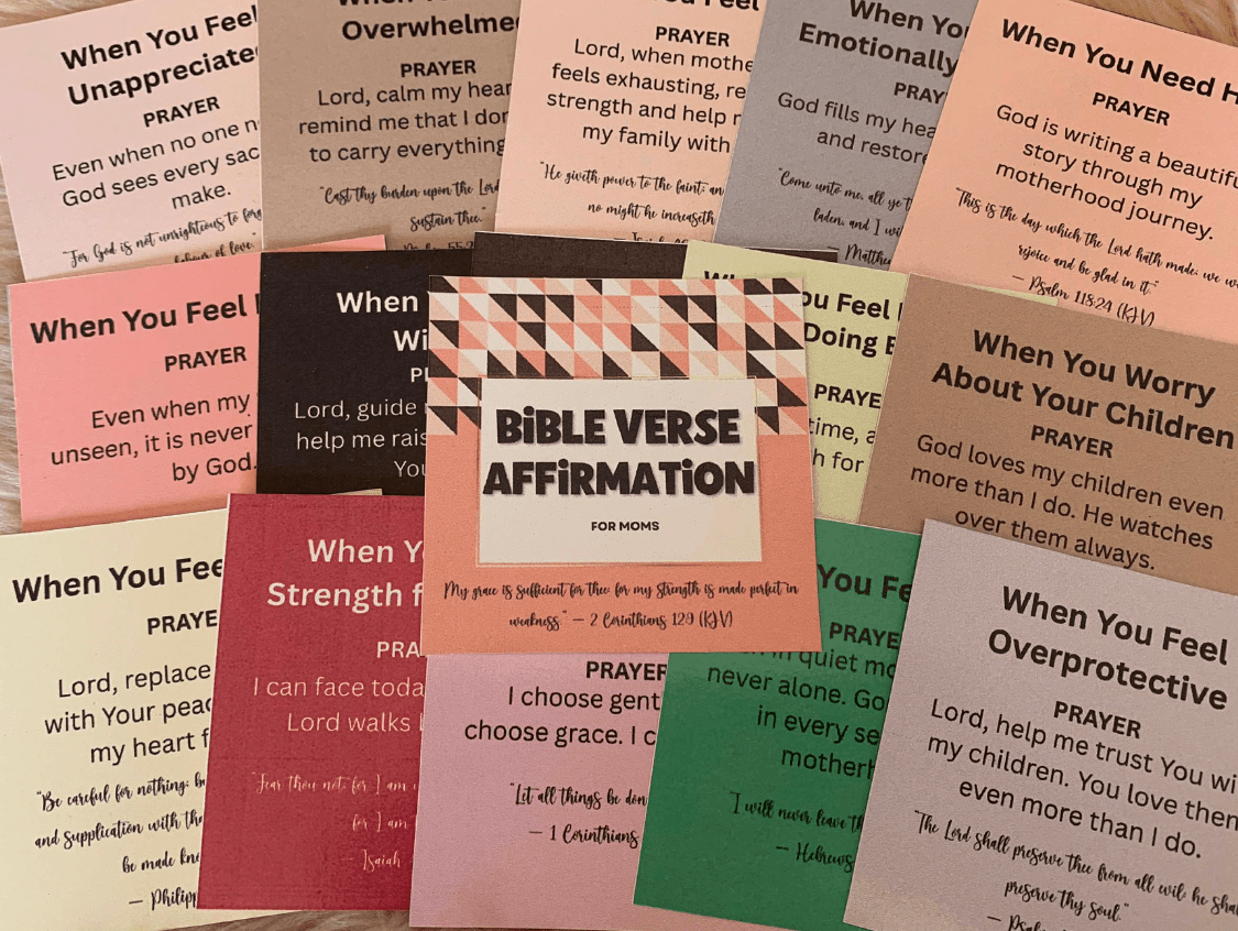 Motherhood is a sacred calling filled with love, sacrifice, and faith. These Bible Verse Affirmation cards are created to remind moms that God sees every prayer whispered, every tear shed, and every act of love given in secret. Each affirmation, paired with God’s Word, speaks strength, peace, and reassurance for every season of motherhood. 🤍📖