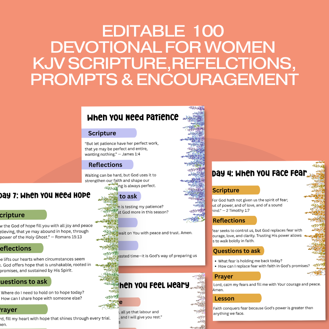 Unlock a complete set of 100 ready-to-use devotional templates designed to guide you in daily reflection, prayer, and journaling. Each template is thoughtfully created to help you: